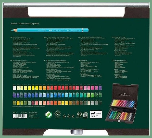 A.Dürer vesivärikynä 72 väriä. Se on erinomainen taiteilijatarvike, jota toimitetaan kun sitä saapuu varastoon (n. viikko). Ominaisuuksia: Korkealaatuiset, hapottomat pigmentit kirkkaissa väreissä, erinomainen valonkestävyys. Pehmeä ja elinvoimainen värinjälki. Täysin vesiliukoinen värilyijy 3,8 mm . Erittäin hyvä murtumiskestävyys Secural-liimausprosessin (SV) ansiosta. Saatavana yksittäisinä väreinä sekä erilaisina lajitelmina. Luotettava toimituspalvelumme kuljettaa tämän tuotteen ilmaisella toimituksella toimitusosoitteeseen kello 8.00 - 15.00. Helsinki, Pori, Espoo, Vantaa... siis minne tahansa Suomeen.