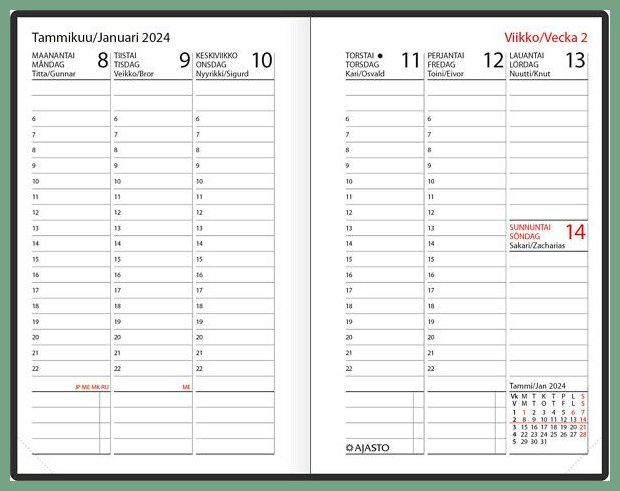 Hinta 21,10€ / kplAjasto taskumemo 148x90mm musta. Tämän erinomaisen kalenteritarvikkeen toimituksen kesto verkkokaupasta tilattuna 1-2 päivää. Ajasto Taskumemo 2026 on keinonahkakantinen taskukalenteri koossa 148 x 90 mm. Aukeamallaan Taskumemo näyttää viikon vaakasuuntaisena. Vaakanäkymä jättää ...VarastossaTarkastele- +