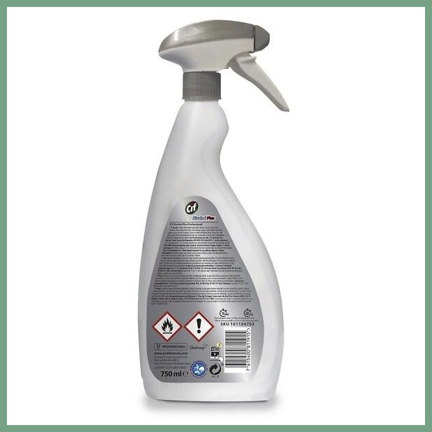 Desinfiointispray Cif Alcohol Plus Professional 750ml 6/ltk. Tämän erinomaisen siivoustarvikkeen verkkokauppatilauksen toimitus perille kestää 1-2 päivää. Cif Alcohol Plus Professional on käyttövalmis etanolipohjainen desinfiointiaine erilaisten pintojen ja erityisesti keittiötilojen desinfiointiin. Tuote soveltuu kovien alkoholia sietävien pintojen ja elintarvikkeiden kanssa kosketuksissa olevien pintojen, kuten leikkuulautojen, astioiden, lämpömittarien ja muiden keittiövälineiden desinfiointiin. Cif Alcohol Plus Professional soveltuu myös ruokakauppojen liha- kala ja muiden tiskien, sekä yleisten kovien pintojen, kuten ruokapöytien ja tuolien desinfiointiin. Tappaa 99,99% bakteereista, hiivoista ja viruksista, mukaan lukien sekä vaipattomat, että vaipalliset virukset (kuten koronavirukset). Desinfiointisprayt myydään kappaleittain, laatikossa on 6 kappaletta. Nopea kuljetuspalvelumme toimittaa desinfiointisprayn toimitusosoitteeseen klo 8 - 15 välillä. Kuopio, Turku, Helsinki... eli kaikkialle Suomeen.
