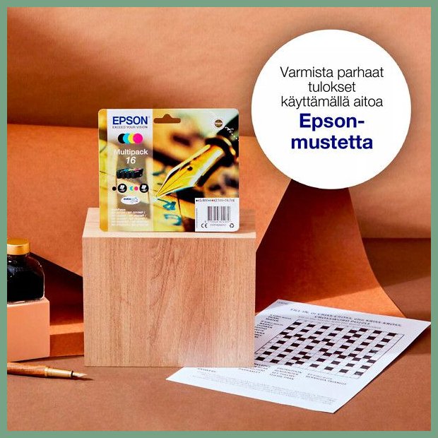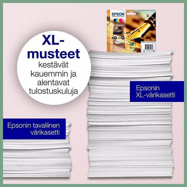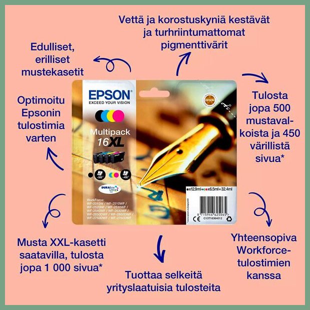 Epson muste T1636-16XL C13T16364012 4-väri värikasetti multipack. Alkuperäinen Epson muste luotettavaan tulostamiseen. Pakkaus sisältää 1 x musta 13 ml, 1 x cyan 7 ml, 1 x keltainen 7 ml ja 1 x 7 ml magenta mustekasetit. Käyttämällä alkuperäisiä Epson värikasetteja, saat tarkkaa tekstiä ja teräviä kuvia joka sivulle. Epson musteet sopivat seuraaviin Epson tulostimiin: Epson WorkForce WF-2010W / WF-2510WF / WF-2520NF / WF-2530WF / WF-2540WF. Mustekasetin toimitusaika verkkokaupasta tilattuna on 1-2 päivää. Täsmällinen kuljetuspalvelumme toimittaa mustekasetin toimitusosoitteeseen klo 8 - 15 välillä. Helsinki, Pori, Espoo, Vantaa... eli kaikkialle Suomeen.