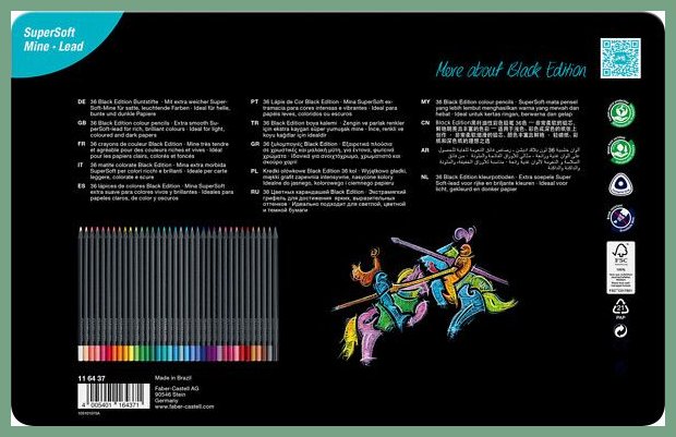 Faber-Castell Black Edition 36 värikynää. Tämän erinomaisen askartelutarvikkeen toimituksen kesto verkkokaupasta tilattuna 1-2 päivää. Black Edition -sarjan kynillä piirrät niin tummille kuin värillisille papereille. Supersoft-värit korostuvat erityisen upeasti mustalla paperilla. Ergonomisen kolmikulmaisen muodon takia kynää on miellyttävä pitää kädessä. Tuotepakattu peltirasiaan. Varma sopimuskuljetuksemme toimittaa tämän tuotteen ilman toimituskuluja toimitusosoitteeseen työpäivän aikana (8 - 15). Kuopio, Turku, Helsinki... siis minne tahansa Suomeen.
