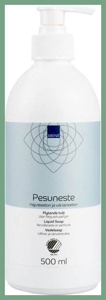 Pesuneste Abena hajusteeton 500ml pumppupullo. Se on hyvä käsienpesuaine, jonka verkkokaupan tilauksen toimitus kestää 1-2 päivää. Käyttöohje: Kastele kädet, iho tai hiukset kunnolla. Ota riittävä määrä pesunestettä ja pese kädet, vartalo ja/tai hiukset, huuhtele huolellisesti. Tuote vain ulkoiseen käyttöön. Vältettävä aineen joutumista silmiin. Täsmällinen sopimuskuljetuksemme toimittaa pesunesteen ilman toimituskuluja toimitusosoitteeseen työpäivän aikana (8 - 15). Kuopio, Turku, Helsinki... eli kaikkialle Suomeen.