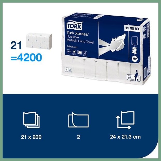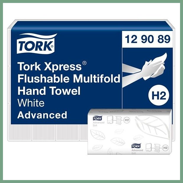 Käsipyyhe Tork H2 Advanced Flushable 2krs 200ark/pkt 21pkt/sk. Se on laadukas siivoustarvike, jonka toimitus hoidetaan heti kun sitä saapuu varastoon (n. viikko). Ainutlaatuinen viemäristä huuhdeltava Tork Xpress® Multifold käsipyyhe on ihanteellinen tiloissa, joissa pyyhkeet saatetaan heittää WC:n viemäriin jäteastian sijaan. Nämä pyyhkeet sopivat Tork Xpress® annostelijaan Multifold käsipyyhkeelle. Se vähentää kulutusta ja näin myös jätettä annostellessaan luotettavasti arkin kerrallaan. Samalla voit tarjota asiakkaillesi hygieenistä mukavuutta. Käsipyhkeet myydään säkeittäin. Pakkauskoot paketissa on 200 arkkia, säkissä on 21 pakettia ja lavalla 32 säkkiä. Täsmällinen sopimuskuljetuksemme toimittaa käsipyhkeen toimitusosoitteeseen työpäivän aikana (8 - 15). Helsinki, Pori, Espoo, Vantaa... siis minne tahansa Suomeen.