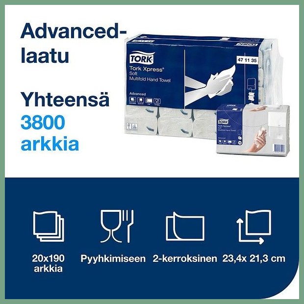 Käsipyyhe Tork Xpress H2 Multifold valkoinen 3800ark. Se on tasokas puhdistusväline, jonka verkkokauppatilauksen toimitus perille kestää 1-2 päivää. Tork Xpress® H2 Multifold -käsipyyhe valkoinen tekee saniteettitiloissa vieraileviin asiakkaisiin vaikutuksen pehmeällä, kestävällä ja imukykyisellä laadulla! Voit käyttää pyyhkeitä yhdessä Tork Xpress® -käsipyyheannostelijan kanssa ja näin vähentää pyyhkeiden turhaa kulutusta. Samalla tilojen hygienia parantuu, sillä käyttäjät koskevat vain käyttämäänsä pyyhkeeseen. Kertakäyttöiset käsipyyhkeemme voidaan myös annostella kätevästi suoraan pakkauksesta. Valitsemalla valkoiset Tork-käsipyyhkeet tuet yrityksesi vastuullisuusperiaatteita, sillä paperipyyhkeemme ovat FSC-sertifioituja ja EU-ympäristömerkittyjä. Ominaisuuksia: Kaunis Tork-lehtikuviointi. Arkki kerrallaan -annostelu vähentää kulutusta ja parantaa hygieniaa. Tork Easy Handling -kuljetuspakkaus. Ihanteellinen käyttöasteeltaan pieniin ja keskikokoisiin saniteettitiloihin. FSC-sertifioitu. EU-ympäristömerkitty. Soveltuu lyhytaikaiseen kosketukseen elintarvikkeiden kanssa. Perustarpeisiin sopiva, taloudellinen käsipyyhe. Ainutlaatuinen Tork Polypack: pyyhkeitä voidaan annostella pakkauksesta ja käyttää missä tahansa. Vähentää kulutusta ja tehostaa hygieniaa annostelemalla yhden käsipyyhkeen kerrallaan. Avainlippu: Tehty Suomessa, Made in Finland. Pakkauskoot: Käsipyhkeet myydään säkeittäin. Pakkauskoot pakkauksessa on 190 arkkia, säkissä on 3800 arkkia, säkissä 3800 arkkia ja lavalla 36 säkkiä. 20 pakkausta / säkki. Tehokas toimituspalvelumme kuljettaa käsipyhkeen toimitusosoitteeseen kello 8.00 - 15.00. Helsinki, Turku, Tampere... eli kaikkialle Suomeen.