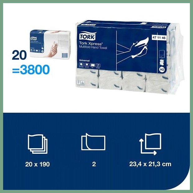 Käsipyyhe Xpress H2 Universal 2-krs valkoinen 3800ark. Se on laadukas siivoustarvike, jonka verkkokauppatilauksen toimitus perille kestää 1-2 päivää. Tork Xpress® Multifold käsipyyhe -järjestelmä sopii ympäristöihin jotka vaativat sekä mukavuutta ja hygieniaa kuten ravintolat, toimistot ja terveydenhuolto palvelut. Peruskäyttöön sopiva käsipyyhe. Annostelija annostelee pyyhkeen kerrallaan: hygieeninen ja vähentää kulutusta. Tork Carry Pack -pakkaus helpottaa käsittelyä ja hävittämistä. Käsipyhkeet myydään säkeittäin. Pakkauskoot paketissa on 190 arkkia, säkissä on 20 pakettia ja lavalla 36 säkkiä. Tehokas sopimuskuljetuksemme toimittaa käsipyhkeen ilman toimituskuluja toimitusosoitteeseen työpäivän aikana (8 - 15). Turku, Oulu, Helsinki... eli kaikkialle Suomeen.