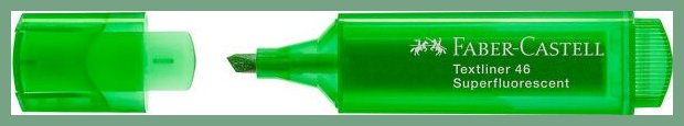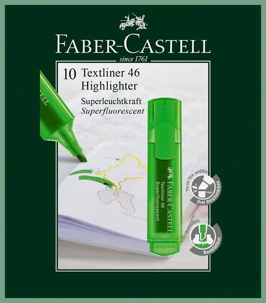 Korostuskynä Faber-Castell Textliner 1546 neonvihreä 1-5 mm. Laadukas korostuskynä eli yliviivaustussi Faber-Castell Textliner 46 Superflourescent, takaa tahriintumattoman jäljen kaikille peruspapereille. Neon värisiä Textliner 46 korostuskyniä on saatavilla useina eri neon väreinä. Korostuskynän viistolla erikoiskärjellä saat aikaiseksi kolme eri viivanleveyttä (1, 2 ja 5 mm). Tämä mahdollistaa sekä isomman alueen korostamisen että tarkan yksityiskohtaisen korostuksen. Textliner 46 yliviivaustussit sopivat tekstin korostamisen lisäksi hyvin esimerkiksi tekstaukseen ja askarteluun. Ympäristöystävälliset superfluorisoivat Faber-Castell Textliner 46 korostuskynät on täytetty vesipohjaisella musteella. Faber-Castell Textliner 46 Superflourescent korostuskynät ovat uudelleen täytettäviä. Korostuskynän toimitusaika verkkokaupasta tilattuna on 1-2 päivää. Nopea sopimuskuljetuksemme toimittaa korostuskynän toimitusosoitteeseen työpäivän aikana (8 - 15). Helsinki, Pori, Espoo, Vantaa... toisin sanoen kaikkialle Suomeen.