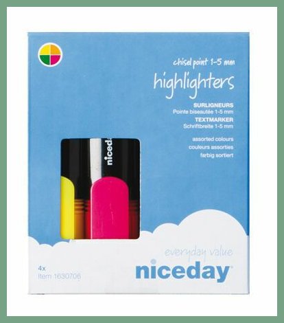 Korostuskynä Niceday 4 värisrj 5mm viistokärki. Se on tasokas yliviivaustussi, jonka verkkokauppatilauksen toimitus perille kestää 1-2 päivää. Korostuskynä, värilajitelma 4 kpl/sarja. Viistokärki 5mm. Vesiohenteinen muste. Valmistettu 70 % kierrätetystä muovista. Tehokas sopimuskuljetuksemme toimittaa korostuskynän ilman toimituskuluja toimitusosoitteeseen työpäivän aikana (8 - 15). Helsinki, Turku, Tampere... toisin sanoen kaikkialle Suomeen.