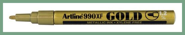 Kultakynä Artline 990fine. Tämän erinomaisen toimistotarvikkeen verkkokauppatilauksen toimitus perille kestää 1-2 päivää. Artlinen metallinväristen huopakynien muste sisältää runsaasti kulta- tai hopeapigmenttiä erinomaisen metallinomaisen vaikutelman luomiseksi. Jälki kuivuu nopeasti ja värit ovat intensiiviset, ne ovat myös hyvin vettä kestäviä ja haalistumattomia. Kynät soveltuvat erinomaisesti esim. pahvin, muovin, lasin, metallin ja posliinin koristeluun tai näille pinnoille kirjoittamiseen. Ennen käyttäänottoa ravista kynää tulppa suljettuna ja pumppaa kärkeä kevyesti pintaa vasten saadaksesi musteen kulkemaan hyvin. Jäljen haalistuessa pyyhi kynän kärki paperilla tai kankaalla. Täsmällinen kuljetuspalvelumme toimittaa kultakynän toimitusosoitteeseen klo 8 - 15 välillä. Helsinki, Turku, Tampere... toisin sanoen kaikkialle Suomeen.