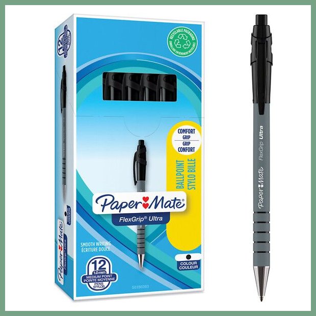 Kuulakärkikynä Papermate Flexgrip Ultra medium musta, 12kpl/ras on ekologinen toimistotarvike. Tämä valmistaja tai tuote on saavuttanut seuraavat ympäristömerkit, ympäristötunnukset sekä laatusertifikaatit. Kuulakärkikynän erinomaisen laadun varmistaa laatusertifikaatti. Ekotoimistotarvikkeet verkkokaupan valikoimaan on valittu paljon laatusertifioituja toimistotuotteita. Suosi ympäristöystävällisiä toimistotuotteita!
