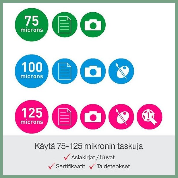 Hinta 301,14€ / KPLAmaris laminointilaitteella voidaan myös kylmälaminoida. Sisältää 10 kpl 80mic laminointitaskua ja puhdistuspaperin. Valmis laminointiin vain 60 sekunnissa ja yhteensopiva kaikkien taskujen kanssa aina 175 mikronin asti. Suositeltu taskujen määrä 75 arkkia päivässä. AutoSense tunnistaa taskun ...