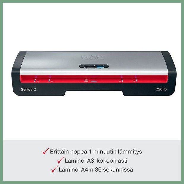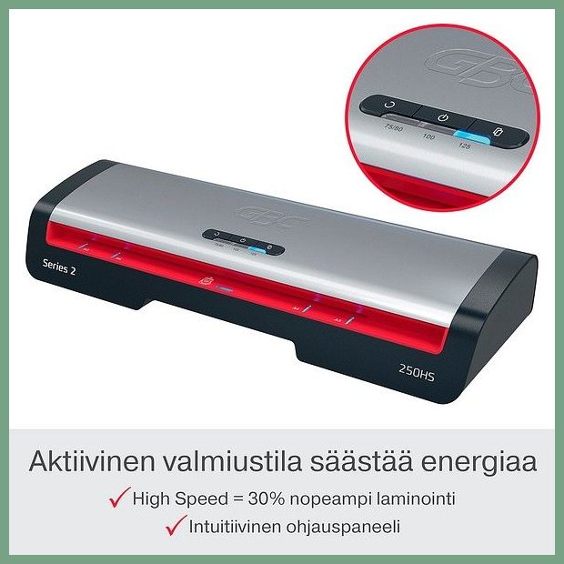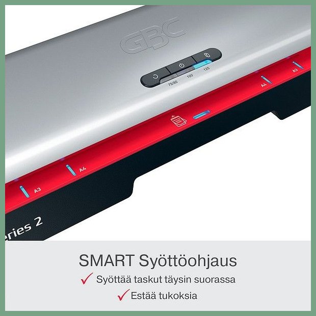 Laminointikone a3 GBC 250HS Office. Se on erinomainen toimistotuote, jonka toimitus hoidetaan heti kun sitä saapuu varastoon (n. viikko). Luotettava, helppokäyttöinen ja tehokas ratkaisu toimiston jokapäiväisiin laminointitarpeisiin. Nopea 1 minuutin lämpenemisaika. Ohjauspaneeli sisältää asetukset kolmelle eri taskupaksuudelle 75-125 mikronin välillä, mikä mahdollistaa joustavuuden eri asiakirjatyypeille. Ohjauspaneelissa on myös jumituksen estopainike, joka mahdollistaa väärin syötettyjen taskujen sujuvan poistamisen. Lisäksi SMART LED-järjestelmä tarjoaa selkeät valo- ja äänimerkit: punainen lämpenemisen aikana, sininen valo äänimerkillä, kun laite on valmis, ja automaattinen sammutus 15 minuutin käyttämättömyyden jälkeen energian säästämiseksi. SMART syöttöaukon LEDit varmistavat taskun suoran kohdistuksen tukosten välttämiseksi, jolloin jokainen laminointi on täydellinen. Suojaa ja säilytä tärkeät asiakirjasi nopeasti ja viimeistele ne tasaisesti ja ammattimaisesti joka kerta. Varma kuljetuspalvelumme toimittaa laminointikoneen ilman toimituskuluja toimitusosoitteeseen klo 8 - 15 välillä. Helsinki, Turku, Tampere... eli kaikkialle Suomeen.