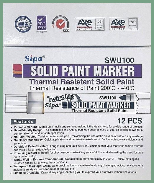 Markkeri Sipa Solid keltainen Twist Up SWU100. Tämän erinomaisen tuotteen toimituksen kesto verkkokaupasta tilattuna 1-2 päivää. Sipa Twist Up SOLID PAINT MARKER on vedenpitävä valinta kun tarvitset merkintäkynää äärilämpötiloissa! Solid Paint Markerin maali on vedenkestävä ja se on suunniteltu käytettäväksi korkeissa lämpötiloissa sekä pakkasella. Täydellinen työväline kaikenlaiseen merkintään sääolosuhteista piittaamatta, sen toimiessa luotettavasti +200°C - -40°C lämpötiloissa. Tuotteen ominaisuudet varmistavat, että merkintäjälki on selkeä tummilla ja vaaleilla pinnoilla sekä pysyvä metalli-, muovi-, puubetoni, kivi ja lasipinnoilla. Kärjen ja kiinteän maalin ansiosta voit piirtää tai kirjoittaa mistä tahansa kulmasta. Käyttökohteita: rakennusala, teollisuus, metallipajat, autohuolto, kaikki ulkona tehtävät merkintätyöt. Kotona paras merkintäkynä kaikkiin tarpeisiin niin sisätiloissa, ulkona puutarhassa ja vajassa sekä autotallissa. Muuta merkintäkynää et tarvitse! Pakkauskoko: 12 kynää rasia / 144 kynää hyllytyslaatikko (sisäpakkaus), 288 kynää kuljetuslaatikko (ulkopakkaus). Luotettava sopimuskuljetuksemme toimittaa markkerin toimitusosoitteeseen työpäivän aikana (8 - 15). Helsinki, Pori, Espoo, Vantaa... toisin sanoen kaikkialle Suomeen.