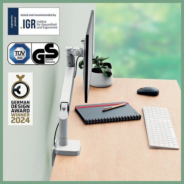 Monitorivarsi Leitz Ergo yhdelle näytölle harmaa. Se on hyvä ergonomiatuote, joka toimitetaan heti kun sitä saapuu varastoon (n. viikko). Leitz Ergo yhden näytön monitorivarsi vaikuttaa myönteisesti ryhtiin, edistää silmien oikeaa kohdistusta ja tukee niska- ja hartiamukavuutta. Kun monitorin korkeus on säädetty oikein ja suositusten mukaisesti, niin voit nauttia ihanteellisesta ergonomisesta asennosta. Monitori pysyy vakaana kaikilla korkeuksilla ja kaikissa kulmissa, ja sen asentoa voi helposti vaihtaa vaaka- ja pystyasennon välillä. Sen design on ihanteellinen, kun tilaa on vähän käytössä, ja se vapauttaa arvokasta työpöytätilaa. Lyhyen varren ansiosta näyttö on mahdollista asettaa hyvin lähellä seinää mahdollistaen maksimaallisen tilan säästön. Ergonomisesti suunniteltu edistämään hyvinvointia ja lisäämään tuottavuutta. Pakkauksessa tulee mukana selkeät kokoamisohjeet varmistaen helpon asennuksen ja kasaamisen. • Tilaa säästävä design mahdollistaa monitorin asentamisen pieniin tiloihin ja tarjoaa silti maksimaalisen terävyyden ja optimaalisen visuaalisen ergonomian • Jousiavusteinen yksittäinen varsi, jolla näytön korkeutta on helppo säätää (185mm-435mm) • Monipuoliset kierto-, kääntö- ja kallistussäädöt vain yhdelle kädellä. +90°/-90° oikea ja vasen kallistus ja jopa 180° horisontaalinen & vertikaalinen näytön kääntö, +55°/- 55° näytön kallistus • Vahva ja vakaa rakenne tukee 17"-32" litteää tai kaarevaa näyttöä, joka painaa jopa 9 kg (19.8lbs) • Helppo asentaa mukana tulevalla pikakiinnitettävällä ja irrotettavalla Vesa®-levyllä (75 ja 100 mm). Silikonikumilla päällystetty c-kiinnike vähentää tärinää ja suojaa työpöydän pintaa tai läpivientireiän avulla (työpöydän paksuusalue: 10-80 mm). Kokoonpano- ja säätötyökalut mukana • Kaapelinhallintajärjestelmän avulla näytön kaapelit ovat järjestyksessä, jotta työtila pysyy siistimpänä • Leitz monitorivarsien ergonomiset ominaisuudet on IGR (Institute of Health and Ergonomics) sertifioitu. Sertifikaatin saaneet tuotteet ovat läpäisseet laajat testit, joissa selvitetään parantaako tuotteet ergonomiaa tuotanto- ja toimistoympäristöissä.Leitz monitorivarsien käyttöturvallisuus on TÜV-sertifioitu. Tämä kertoo, että tuote on Saksan tuoteturvallisuuslakien vaatimusten mukainen. Luotettava kuljetuspalvelumme toimittaa monitorivarren ilman toimituskuluja toimitusosoitteeseen klo 8 - 15 välillä. Helsinki, Turku, Tampere... eli kaikkialle Suomeen.