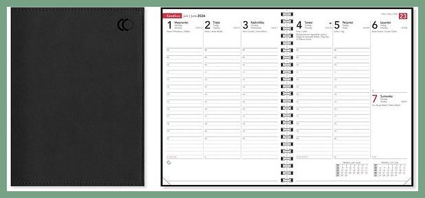 Hinta 14,40€ / KPLOmmeltu A5-kokoinen kalenteri. Hienostunut keinonahkainen kansi. Viikot 50/2025-1/2027, vuosisuunnittelu 2026 ja vuosi 2027 laajennettuna. Viikko aukeamalla, tunnit 8-20. Liputuspäivät, kansalliset pyhät aukeamilla ja luettelona, nimipäivät, tehtäväruudukko, tehtäväluettelo, vuosikalenterit ...