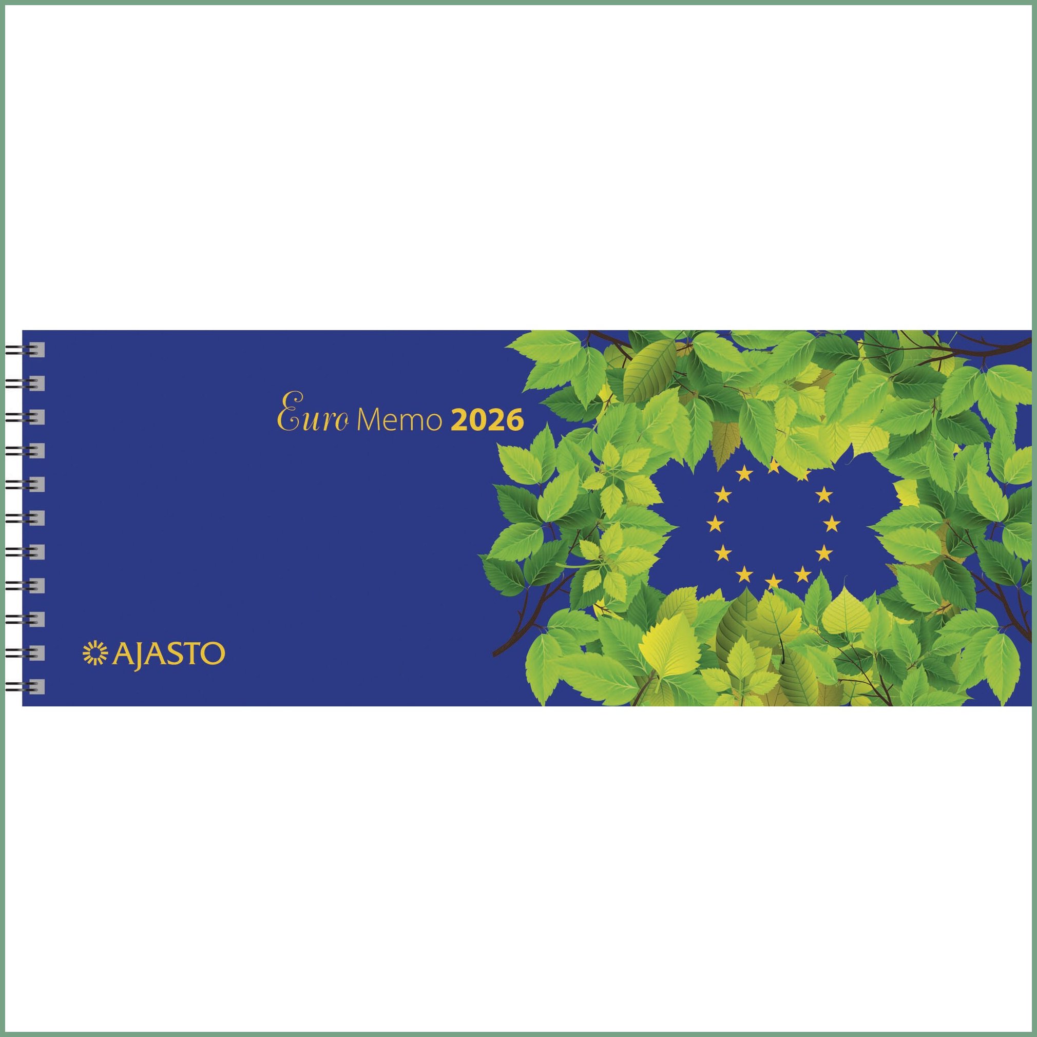 Ajasto euro memo 255x95. Tämän erinomaisen kalenteritarvikkeen verkkokauppa tilauksen kuljetus perille asti kestää 1-2 päivää. Ajasto Euro Memo 2026 -pöytäkalenteri sisältää kieliversiot suomi, ruotsi, englanti, saksa ja ranska. Monikielisyyden ansiosta Euro Memo 2023 sopii esimerkiksi monikansalliseen yritykseen, jossa tarpeen pitää säännöllistä yhteyttä ulkomaille. Ajasto Euro Memo 2026 näyttää aukeamalla täyden viikon, kolmen kuukauden seurannan sekä kuluvan viikon numeron. Kierresidotut kannet tekevät kalenterin käsittelystä helppoa ja miellyttävää. Euro Memo 2026 tärkeimmät ominaisuudet: koko 255 x 95 mm kierresidottu päiväkirja 50/2025–1/2027 vuosisuunnitelmat 2026 ja 2027 kansalliset vapaapäivät kiinteä puhelinmuistio FSC®-serfifioitu tuote kielisyys suomi, ruotsi, englanti, saksa, ranska kartonkikannet muistiinpanotilaa Ajasto-kalenterit ovat pääosin kotimaista tuotantoa. Kalentereiden suunnittelussa muiden muassa ekologisuus ja laatu ovat tärkeässä asemassa. Euro Memo 2026 pöytäkalenteri painetaan sertifioidulle paperille. Sertifioidulla FSC-paperilla olet mukana edistämässä vastuullista metsänhoitoa. Kalentereilla ei ole vaihto- eikä palautusoikeutta. Luotettava kuljetuspalvelumme toimittaa tilauksen toimitusosoitteeseen klo 8 - 15 välillä. Kuopio, Turku, Helsinki... eli kaikkialle Suomeen.