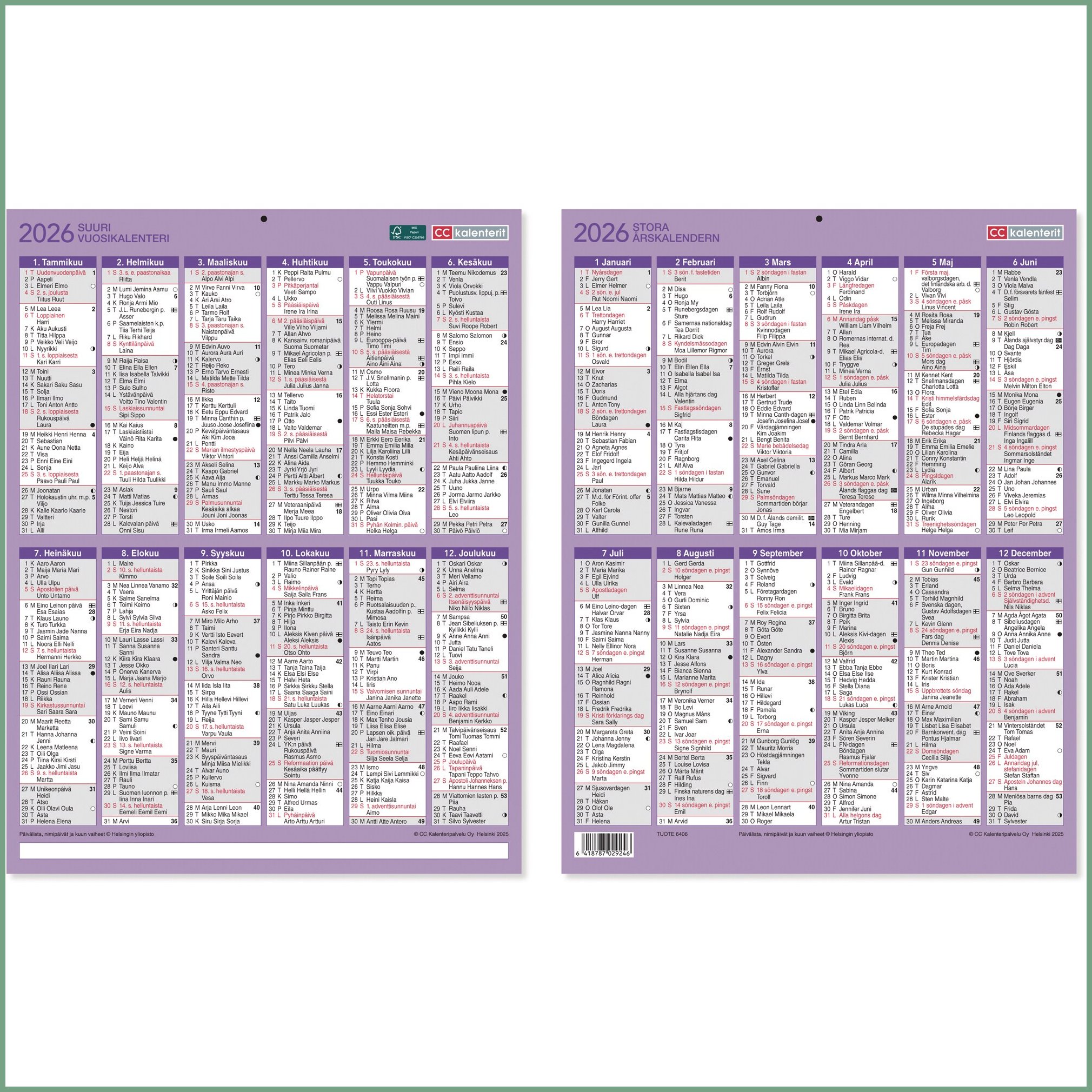 Koko 102 x 430 mm, pystykalenteri pöydälle tai seinälle. Suomen- ja ruotsinkielinen kapea taulukkokalenteri, jossa kumpikin kieli on omalla puolellaan. Liputuspäivät, kansalliset pyhät, nimipäivät, kuun vaiheet. Ripustusreikä, tukevaa mattakartonkia. Painettu FSC-sertifioidulle paperille.Hinta 1,73€ / KPL