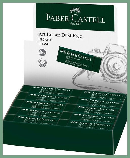 Pyyhekumi Faber-Castell ArtEraser vihreä 20kpl. Tämän erinomaisen tuotteen toimituksen kesto verkkokaupasta tilattuna 1-2 päivää. Korkealuokkainen pölyämätön pyyhekumi taiteilijakäyttöön. Soveltuu esim. hiili- ja pastellitöiden korjaamiseen ja työstämiseen. Pyyhekumin ansiosta kumittaminen on helppoa ja siistiä. Sen muoto mahdollistaa yksityiskohtaisen kumittamisen. Sen materiaalin ansiosta murut ovat helppo pyyhkiä paperilta. Pyyhekumi ei sisällä lateksia ja on dermatologisesti testattu ja hyväksytty. Ei sisällä haitallista Ftalaattia. Pyyhekumit myydään rasioittain. rasiassa on 20 kappaletta. Tehokas kuljetuspalvelumme toimittaa pyyhekumin toimitusosoitteeseen klo 8 - 15 välillä. Kuopio, Turku, Helsinki... toisin sanoen kaikkialle Suomeen.