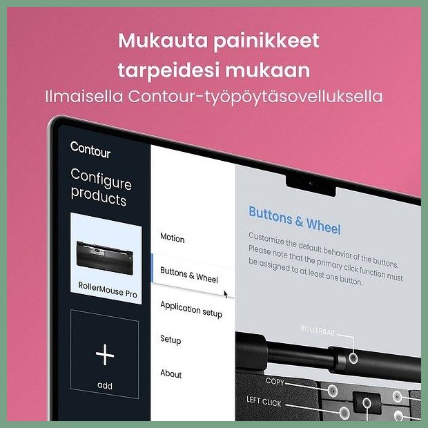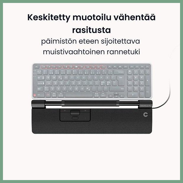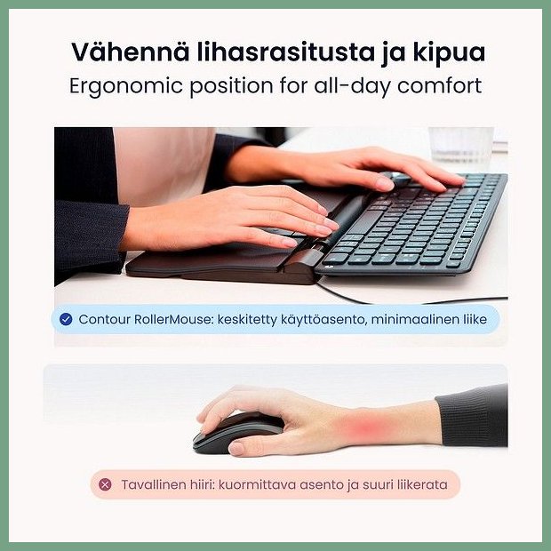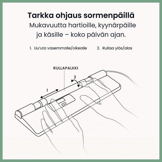 Rollermouse Contour Pro WL hiiriohjain langaton vegan lea. Se on tasokas tietokonetarvike, jonka verkkokauppatilauksen toimitus perille kestää 1-2 päivää. Kaksi kättä on parempi kuin yksi Kaksi kättä on parempi kuin yksi Keskitettyä hiirtä käytettäessä käsivarret ovat luonnollisessa asennossa suoraan kehon edessä. Tällöin hartioihin, käsivarsiin ja kyynärpäihin kohdistuva jännitys poistuu, ja työskentelyasento on mukava ja ergonominen. Lisäksi se mahdollistaa vaihtelun, sillä osoitinta voidaan ohjata sekä oikealla että vasemmalla kädellä. Napsautettava Rollerbar-tanko liikkuu kevyellä sormenpäiden kosketuksella. Kaikki tarvitsemasi toiminnot ovat aina käden ulottuvilla. Yksilölliset tarpeet, yksilölliset ratkaisut Mukauta RollerMouse Pro omien mieltymystesi mukaan ainutlaatuisilla magneettisilla rannetuilla, joiden avulla voit helposti vaihtaa eri mallien välillä. Valitse vegaaninen nahka, kangas tai luonnonbambu, kolmessa eri koossa. Vegaanisessa nahkaversiossa on antibakteerinen pinta ja paras alkoholinkestävyys parantamaan hygieniaa. Napsautusääniä, kohdistimen nopeutta ja napsautusvastusta on helppo muuttaa ja löytää itsellesi parhaiten sopiva asetus. Plug & Play - asennus RollerMouse Pro voidaan yhdistää PC- ja Mac-tietokoneisiin Bluetooth-yhteydellä, USB-vastaanottimella tai USB-johdolla. Ohjain sopii käytettäväksi sekä täysikokoisten että kompaktien näppäimistöjen kanssa. Sen avulla voidaan hallita useita näyttöjä ja sen ohjelmoitaviin painikkeisiin voidaan asettaa eniten käytetyt näppäinoikotiet. Pakkauksessa regular ja vegan leather rannetuet. Ohjainrullan tangon pituus 180 mm, tangon pituus 297 mm. Varma toimituspalvelumme kuljettaa rollermousen ilmaisella toimituksella toimitusosoitteeseen kello 8.00 - 15.00. Turku, Oulu, Helsinki... siis minne tahansa Suomeen.