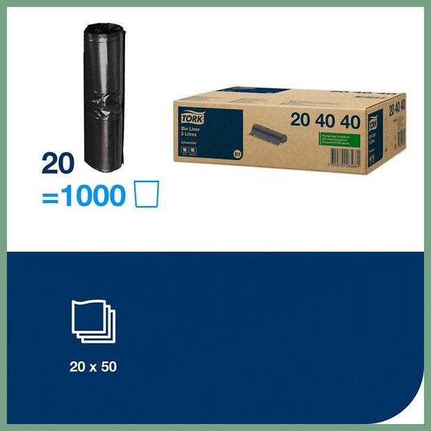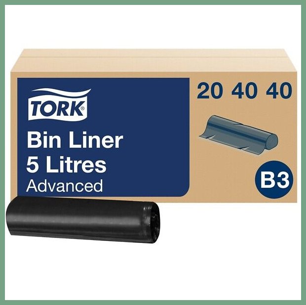 Roskapussi Tork B3 5L musta 50kpl. Se on tasokas jätehuoltotuote, jota toimitetaan kun sitä saapuu varastoon (n. viikko). Tork roskapussi 5l. Toimitetaan rullissa: helppo ylläpito. Huippulaadukasta muovia: vahvaa ja kestävää. B3 -roska-astiat. Roskapussit myydään 20 rullan erissä. Pakkauskoot rullassa on 50 pussia, laatikossa on 20 rullaa. Luotettava kuljetuspalvelumme toimittaa roskapussin ilman toimituskuluja toimitusosoitteeseen klo 8 - 15 välillä. Kuopio, Turku, Helsinki... toisin sanoen kaikkialle Suomeen.