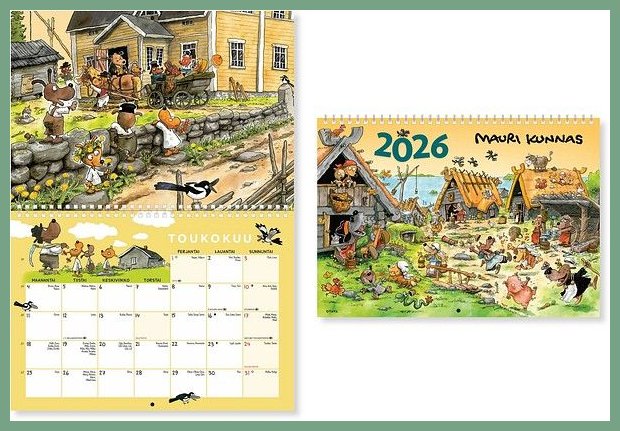 Seinäkalenteri Mauri Kunnas 2026. Tämän erinomaisen kalenteritarvikkeen verkkokaupan tilauksen toimitus kestää 1-2 päivää. Perinteinen ruudukkomallinen seinäkalenteri Mauri Kunnaksen riemukkailla kuva-aiheilla koko vuoden iloksi! Joka kuukaudelle vuodenaikaan sopiva kuvitus tutuista kirjoista. Koko avattuna 297 x 420 mm, 12 kuukausiaukeamaa nimi- jajuhlapäivin. Wiresidottu, ripustuslenkki. Suomenkielinen. Painettu FSC-sertifioidulle paperille. Tehokas sopimuskuljetuksemme toimittaa seinäkalenterin toimitusosoitteeseen työpäivän aikana (8 - 15). Kuopio, Turku, Helsinki... toisin sanoen kaikkialle Suomeen.