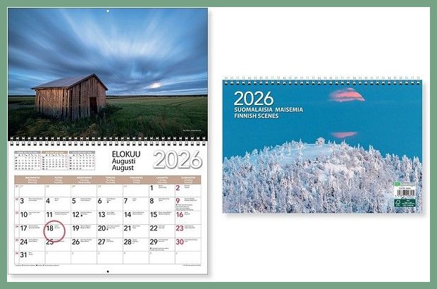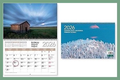 Seinäkalenteri Suomalaisia maisemia 2026. Tämän erinomaisen kalenteritarvikkeen verkkokaupan tilauksen toimitus kestää 1-2 päivää. Luontoa ja maisemia kauniista Suomesta! Koko avattuna 300 x 400 mm, 12 kuukautta, kuva ja kuukausi omalla lehdellään. Aukeamalla kolmen kuukauden seuranta, nimi- ja juhlapäivät, kuun vaiheet, päiväkohtaista kirjoitustilaa. Lisäksi 2026-vuosikalenteri. Wiresidottu, ripustusreikä, staattinen päiväjuoksija. Kieliasu suomi, ruotsi ja englanti. Painettu FSC-sertifioidulle paperille. Luotettava kuljetuspalvelumme toimittaa seinäkalenterin toimitusosoitteeseen klo 8 - 15 välillä. Turku, Oulu, Helsinki... toisin sanoen kaikkialle Suomeen.