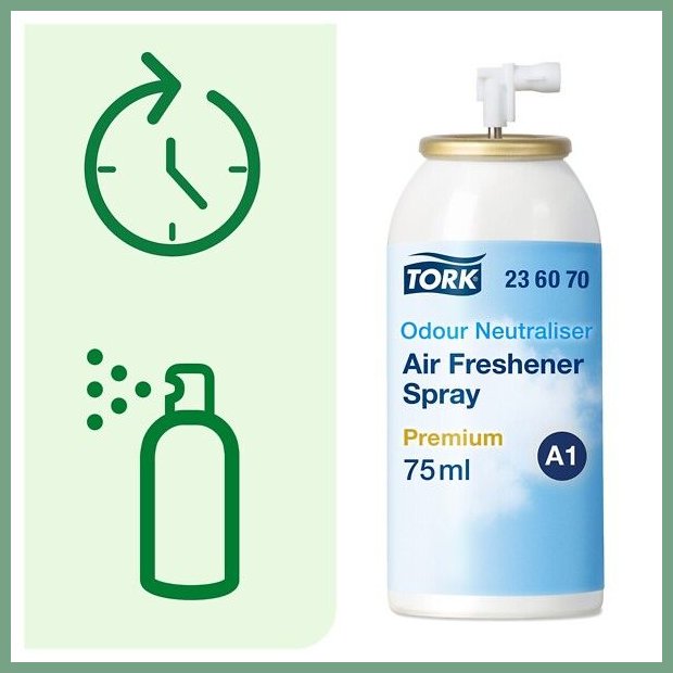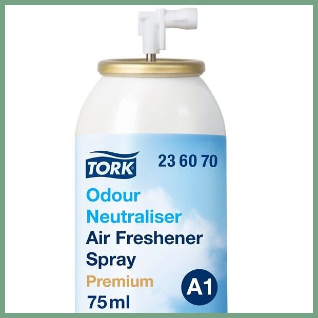 Spray Tork A1 neutralisoiva ilmanraikastussuihke 75ml. Se on hyvä puhdistusväline, jonka toimitus hoidetaan heti kun sitä saapuu varastoon (n. viikko). Tork Odour Neutraliser spray ilmanraikastin A1 (neutralisoiva) hallitsee saniteettitilan hajuja tehokkaasti. Jokaisessa täyttöpakkauksessa 3 000 suihkekertaa. Spray ilmanraikastimet sisältävät konsentroituja tuoksuöljyjä ja ainutlaatuisia, hajuja neutraloivia aineita, jotka paitsi poistavat epämiellyttäviä hajuja my. Sprayt myydään 12 kappaleen erissä, laatikossa on 12 kappaletta. Tork ilmanraikastinannostelijan tuotekoodi 530093.ös raikastavat ilman pitkäkestoisesti. Ilmanraikastimet sopivat käytettäväksi Tork annostelijassa spray ilmanraikastimelle A1. Tehokas kuljetuspalvelumme toimittaa sprayn ilman toimituskuluja toimitusosoitteeseen klo 8 - 15 välillä. Helsinki, Pori, Espoo, Vantaa... toisin sanoen kaikkialle Suomeen.