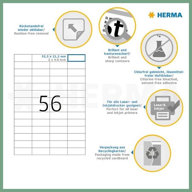 Tarra-arkki Herma 5080 A4/56-os siirrettävä 52,5x21,2mm 25ark on ekologinen toimistotarvike. Tämä valmistaja tai tuote on saavuttanut seuraavat ympäristömerkit, ympäristötunnukset sekä laatusertifikaatit. Laatusertifikaatti takaa tarra-arkin erinomaisen laadun. Econ toimistotarvikkeet - valikoimaan on valittu runsain mitoin laatusertifioituja toimistotuotteita. Suosi luontoa säästäviä toimistotuotteita!
