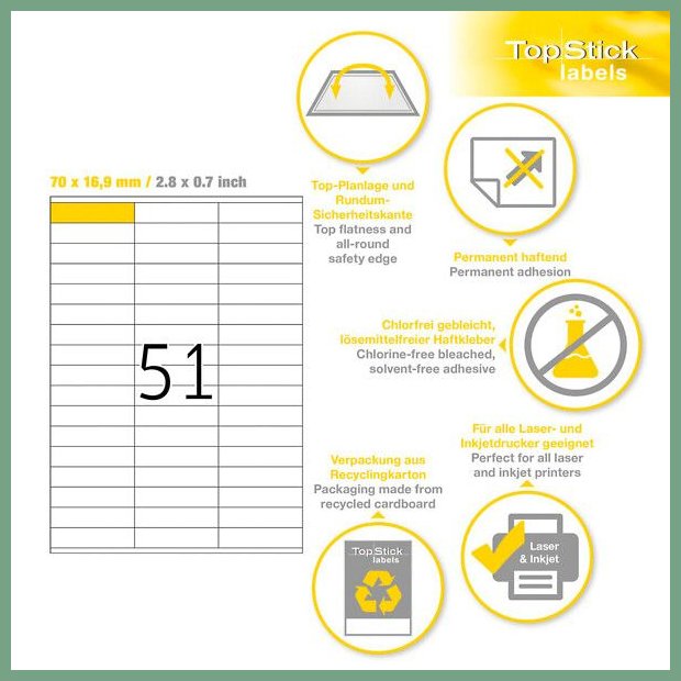 Tarra-arkki Top Stick 8779 A4/51-osainen 70x16,9mm 100ark on ympäristöystävällinen toimistotarvike. Tämä tuote tai sen valmistaja on saavuttanut nämä laatusertifikaatit sekä ympäristömerkit ja -tunnukset. Laatusertifikaatti takaa tarra-arkin laadun. Ekotoimistotarvikkeet verkkokaupan valikoimaan on valittu paljon laatusertifioituja toimistotarvikkeita. Suosi ekologisia tarvikkeita!