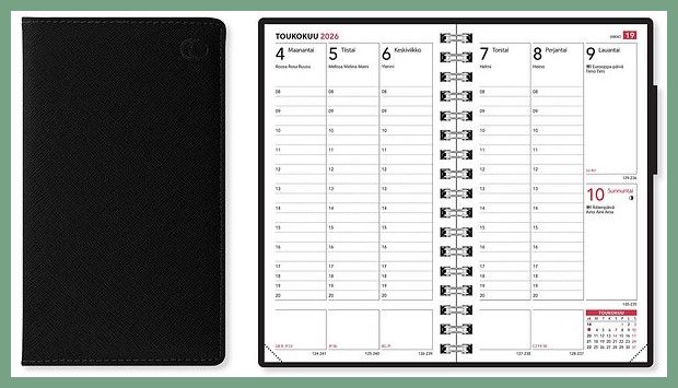 Time musta 2026. Tämän erinomaisen kalenteritarvikkeen verkkokaupan tilauksen toimitus kestää 1-2 päivää. Tehokas ja selkeä Time-kalenteri tarjoaa runsaasti kirjoitustilaa. Koko 87 x 153 mm, viikot 50/2025-1/2027, vuosisuunnittelu 2026 ja laajennettu 2027, tehtäväluetteloita, infosivuja, muistiinpanosivuja. Aukeamalla viikko, tunnit 8-20, liputuspäivät, kansalliset pyhät aukeamilla ja luettelona, nimipäivät. Wiresidottu, kulmaperforoitu. Mustat keinonahkakannet, joissa siirrettävä Notes-muistio. Suomenkielinen. Painettu FSC-sertifioidulle paperille. Nopea kuljetuspalvelumme toimittaa tilauksen toimitusosoitteeseen klo 8 - 15 välillä. Helsinki, Pori, Espoo, Vantaa... eli kaikkialle Suomeen.