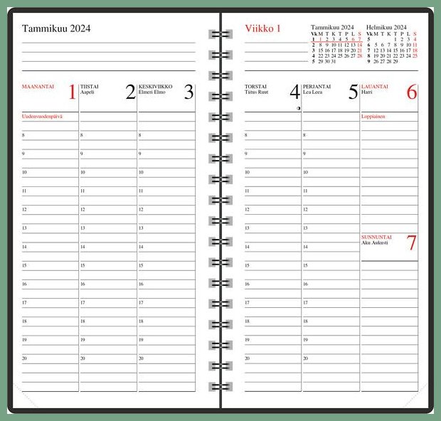 Hinta 5,30€ / KPLTehokas ja selkeä Time-kalenteri tarjoaa runsaasti kirjoitustilaa. Koko 87 x 153 mm, viikot 49/2024-1/2026, vuosisuunnittelu 2025 ja laajennettu 2026, tehtäväluetteloita, infosivuja, muistiinpanosivuja. Aukeamalla viikko, tunnit 8-20, liputuspäivät, kansalliset pyhät aukeamilla ja luettelona, ...