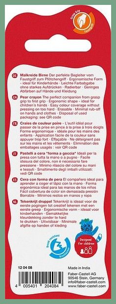 Vahakynä FC päärynänmuotoinen yli 2-vuotiaille. Se on hyvä askartelutarvike, jonka verkkokauppa tilauksen kuljetus perille asti kestää 1-2 päivää. Faber-Castell on valmistanut pienelle aloittelevalle taiteilijalle päärynänmuotoiset vahaliidut, jotka ovat korkealuokkaiset ja turvalliset. Ne tukevat lapsen motoriikkaa ja luovuutta kehittäen kynäotetta. Liidut on tarkoitettu yli kaksivuotiaalle taiteilijanalulle. Ergonominen muoto jota miellyttävä pitää. Materiaali ei sotke käsiä. Luotettava sopimuskuljetuksemme toimittaa vahakynän ilman toimituskuluja toimitusosoitteeseen työpäivän aikana (8 - 15). Helsinki, Turku, Tampere... siis minne tahansa Suomeen.