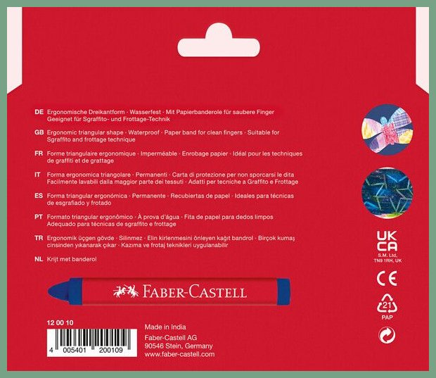 Vahaliitu Faber-Castell kolmikulmainen, 12 väriä/ras. Tämän erinomaisen askartelutarvikkeen verkkokauppatilauksen toimitus perille kestää 1-2 päivää. Ergonominen kolmiomainen vahaliitu, käsi ei väsy pidempäänkään väritettäessä. Värit ovat kirkkaat ja levittyvät helposti. Liiduissa on paperisuojus. Nopea toimituspalvelumme kuljettaa vahaliidun ilmaisella toimituksella toimitusosoitteeseen kello 8.00 - 15.00. Kuopio, Turku, Helsinki... siis minne tahansa Suomeen.