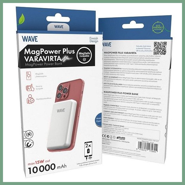 Varavirtalähde Wave MagPower Plus 10000mah valkoinen. Tämän erinomaisen toimistotuotteen toimituksen kesto verkkokaupasta tilattuna 1-2 päivää. MagSafe YHTEENSOPIVA Varavirta kiinnittyy kätevästi magneetilla MagSafe yhteensopiviin laitteisiin ja optimoi latausvirran automaattisesti ladattavan laitteen mukaan. Varavirta lataa laitteita langattomasti jopa 15W teholla, joten lataaminen on sekä vaivatonta että nopeaa. KEVYT JA KOMPAKTI Wave MagPower Plus on äärimmäisen kompakti, sillä se on lähes luottokortin kokoinen, vain parin sentin paksuinen ja painaa ainoastaan 185 grammaa. KÄYTTÄJÄYSTÄVÄLLINEN Pienen kokonsa ansiosta varavirta on käytössä lähes huomaamaton, joka tekee ladattavan laitteen samanaikaisesta käytöstä helppoa ja luontevaa. Tekniset tiedot: ? Akku: 10000mAh, Li-Polymer ? Output Wireless Qi: 15W | 10W | 7,5W | 5W ? Input USB Type-C: 5V/3A | 9V/2A | 12V/1,5A ? Output. Tehokas kuljetuspalvelumme toimittaa varavirtalähteen toimitusosoitteeseen klo 8 - 15 välillä. Helsinki, Turku, Tampere... siis minne tahansa Suomeen.