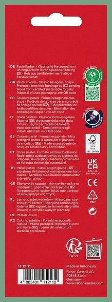 Värikynä Faber-Castell pastel kuusikulmainen 10 väriä/rasia on ympäristöystävällinen toimistotarvike. Tämä valmistaja tai tuote on saavuttanut seuraavat ympäristömerkit, ympäristötunnukset sekä laatusertifikaatit. Värikynän erinomaisen laadun varmistaa laatusertifikaatti. Eco-toimistotarvikkeet.fi - valikoimaan on valittu paljon laatusertifioituja tarvikkeita. Suosi ekologisia toimistotuotteita!