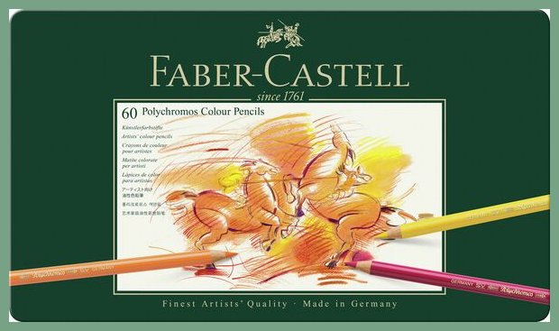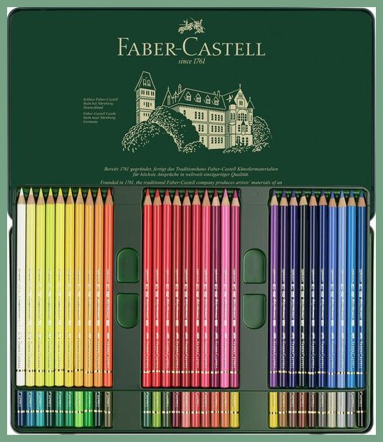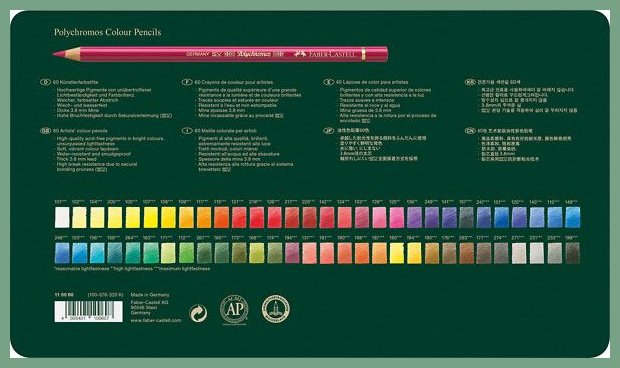 Värikynä Faber-Castell Polychromos 60 väriä. Se on laadukas taiteilijatarvike, jonka toimituksen kesto verkkokaupasta tilattuna 1-2 päivää. Faber-Castell Polychromos -värikynät ovat korkealuokkaisia ammattitaiteilijatason tuotteita. Lyijy huippulaadukas vahapohjainen tuote, jonka pigmentit ja valonkesto ovat erinomaiset, värit ovat erittäin peittävät, lyijyn halkaisija on 3,8 mm. Korkea murtumiskestävyys secural-sidontaprosessin (SV) ansiosta. Väri liukenee tärpättiin. 60 väriä metallirasiassa. Nopea toimituspalvelumme kuljettaa värikynän toimitusosoitteeseen kello 8.00 - 15.00. Kuopio, Turku, Helsinki... toisin sanoen kaikkialle Suomeen.