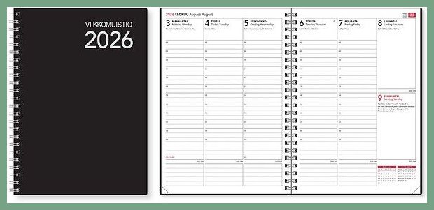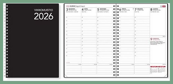 Viikkomuistio-vuosipaketti 2026. Tämän erinomaisen kalenteritarvikkeen verkkokauppatilauksen toimitus perille kestää 1-2 päivää. Koko A5, viikot 49/2025-1/2027, vuosisuunnittelu 2026 ja 2027 laajana, projektisuunnittelu. Aukeamalla viikko ja kahden kuukauden seuranta, tunnit 8-19, liputuspäivät, kansalliset pyhät ja nimipäivät aukeamilla sekä luettelona. Tehtäväruudukko, tehtäväluettelot, syntymäpäivä- ja lahjasivu. Vuosikalenterit 2027-2030. Runsaasti päiväkohtaista muistiinpanotilaa. Wiresidottu, kulmaperforoitu. Mustat kestävät polypropeenikannet, sopii käyttöön myös sellaisenaan. Yhteensopiva myös muiden kustantajien pujotuskansioihin. Kieliasu suomi, ruotsi ja englanti. Painettu FSC-sertifioidulle paperille. Varma kuljetuspalvelumme toimittaa tilauksen toimitusosoitteeseen klo 8 - 15 välillä. Turku, Oulu, Helsinki... siis minne tahansa Suomeen.