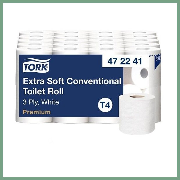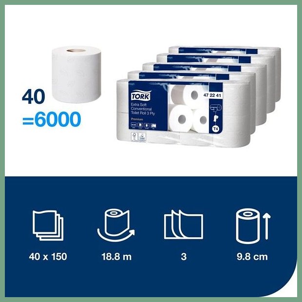 Wc-paperi Tork Extra Soft Premium T4 3-krs 150 ark 40rll. Tämän erinomaisen toimistotarvikkeen verkkokauppatilauksen toimitus perille kestää 1-2 päivää. Premium-laatuinen wc-paperi on erityisen pehmeä ja puhtaan valkoinen. Perinteinen pieni rulla sopii kaiken tyyppisiin saniteettitiloihin. Rullan pituus 18,8 metriä. Pakkauskoko:, (). Wc-paperit myydään säkeittäin. Pakkauskoot paketissa on 8 rullaa, säkissä on 5 pakettia, säkissä 40 rullaa ja lavalla 40 säkkiä. Luotettava kuljetuspalvelumme toimittaa wc-paperin ilman toimituskuluja toimitusosoitteeseen klo 8 - 15 välillä. Kuopio, Turku, Helsinki... eli kaikkialle Suomeen.