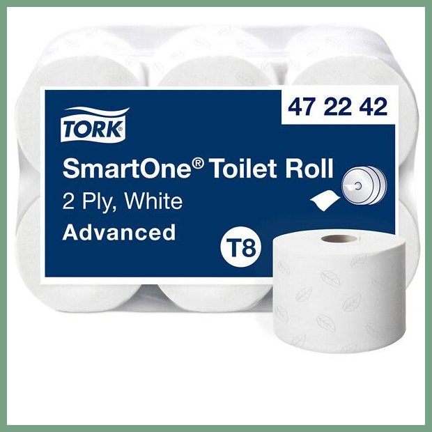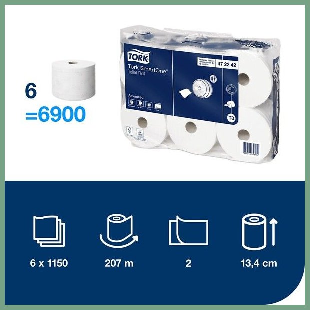 Wc-paperi Tork SmartOne 2-krs, 1150ark/rll, 6rll/sk. Tämän erinomaisen tuotteen verkkokaupan tilauksen toimitus kestää 1-2 päivää. Tork SmartOne järjestelmä (T8) annostelee yhden arkin kerrallaan, vähentää kulutusta ja kustannuksia. Sopii erinomaisesti saniteettitiloihin, joissa kävijämäärä runsas tai jopa kaikkein vaativimpiin ympäristöihin. Wc-paperit myydään säkeittäin. Pakkauskoot rullassa on 1150 arkkia, säkissä on 6 rullaa ja lavalla 64 säkkiä. Varma sopimuskuljetuksemme toimittaa wc-paperin ilman toimituskuluja toimitusosoitteeseen työpäivän aikana (8 - 15). Helsinki, Pori, Espoo, Vantaa... siis minne tahansa Suomeen.