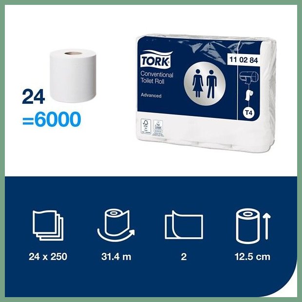 Wc-paperi Tork T4 Advanced 2-krs valkoinen 24rll. Se on laadukas toimistotuote, jonka verkkokauppatilauksen toimitus perille kestää 1-2 päivää. Hyvälaatuinen perinteinen WC-paperi sopii kaikentyyppisiin saniteettitiloihin. Korkealaatuiset, valkoiset ja perinteiset wc-paperirullat. Suosittuja monenlaisissa saniteettitiloissa. T4. Wc-paperit myydään säkeittäin. Pakkauskoot paketissa on 8 rullaa, säkissä on 3 pakettia ja lavalla 72 säkkiä. Luotettava kuljetuspalvelumme toimittaa wc-paperin toimitusosoitteeseen klo 8 - 15 välillä. Kuopio, Turku, Helsinki... toisin sanoen kaikkialle Suomeen.
