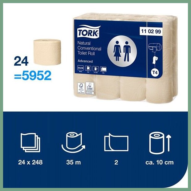 Hinta 23,45€ / 24 kplWc-paperi tork 110299 natural t4 24kpl. Se on hyvälaatuinen toimistotarvike, jonka verkkokaupan tilauksen toimitus kestää 1-2 päivää. Tällä wc-paperilla tasapainotat vähemmän kiireisten saniteettitilojen kustannukset ja suorituskyvyn. paperi valmistetaan 100- prosenttisesta kierrätyskuidusta.