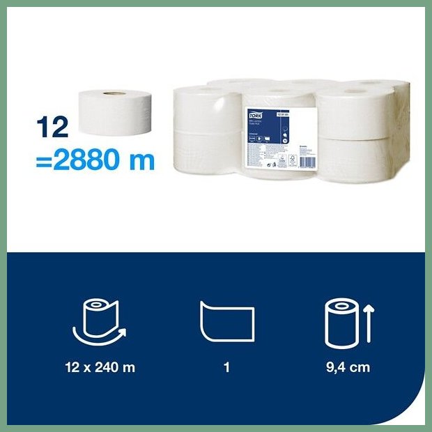 Wc-paperi Tork Universal T2 mini jumbo T2 1-krs. Se on laadukas tuote, jonka toimitus hoidetaan heti kun sitä saapuu varastoon (n. viikko). Tork Mini Jumbo WC-paperi järjestelmä (T2)soveltuu parhaiten saniteettitilaan jossa kävijöitä kohtalaisesti tai paljon. Universal laatu. Suuri kapasiteetti: vähemmän täydennys kertoja. Taloudellinen rullan pituus. Wc-paperit myydään säkeittäin. Pakkauskoot rullassa on 1714 arkkia, säkissä on 12 rullaa. Täsmällinen kuljetuspalvelumme toimittaa wc-paperin ilman toimituskuluja toimitusosoitteeseen klo 8 - 15 välillä. Helsinki, Pori, Espoo, Vantaa... siis minne tahansa Suomeen.