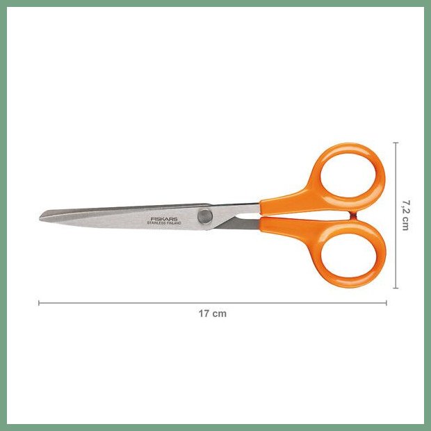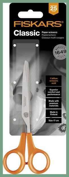 Yleissakset Fiskars Classic 16cm askartelu. Tämän erinomaisen toimistotuotteen verkkokauppatilauksen toimitus perille kestää 1-2 päivää. Fiskars® Classic-paperisakset sopivat yleissaksiksi kevyille materiaaleille. Pyöristetyt, pitkät teräväkärkiset terät tekevät paperisaksista monipuoliset. Sopii yleissaksiksi kevyille materiaaleille. Valmistettu Suomessa laadukkaista ja kestävistä materiaaleista, testattu käsin Oikea- että vasenkätisille. Materiaalina ruostumaton teräs. Sakset voi pestä tiskikoneessa. Pituus: 17 cm. Tuotteella on Fiskars 25 vuoden takuu. Täsmällinen kuljetuspalvelumme toimittaa yleissakset ilman toimituskuluja toimitusosoitteeseen klo 8 - 15 välillä. Turku, Oulu, Helsinki... toisin sanoen kaikkialle Suomeen.